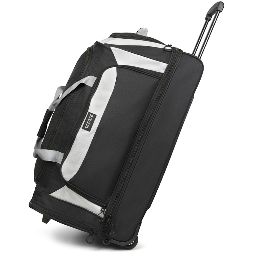 Сумка дорожня на колесах TravelZ Wheelbag Doubleloader black 96L (603098) - дорожня сумка з м яким корпусом, на колесах, об'ємом 96 літрів із телескопічною ручкою. Завдяки двом містким боковим кишеням і великому основному відділенню з U-подібним отвором цю сумку зручно використовувати, а її об'єм не поступається великій валізі. Велике нижнє відділення об'ємом близько 25 літрів можливо використовувати для взуття. Якщо сумка заповнена речами, то вона може стояти вертикально, завдяки спеціальній підставці з лівого боку. Ручки по обидва боки дозволяють легко підійняти сумку. Утоплені колеса вбудовані в тверду опорну пластину з протекторами. Висувна ручка регулюється у двох положеннях до 95 см і це зручно для людей високого зросту.